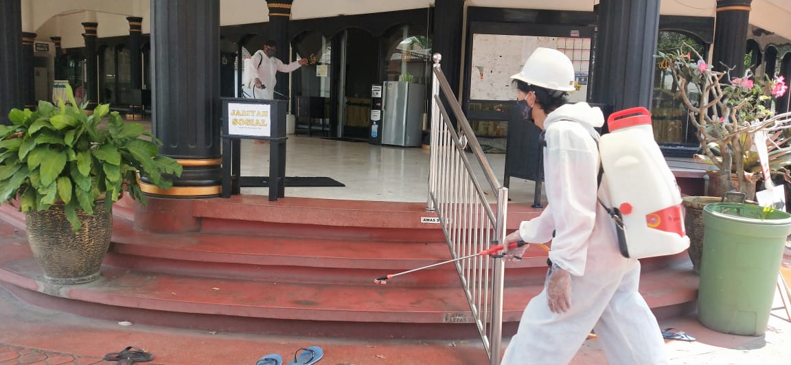 Penyemprotan disinfektan kali ini dilaksanakan di tempat ibadah yakni Masjid Jamik Dinoyo kota Malang pagi tadi, Jumat (09/10/2020).