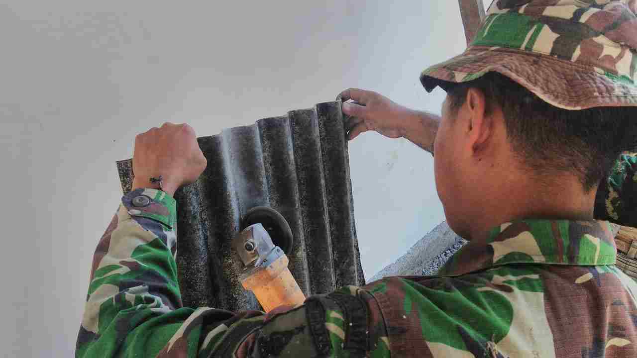 “Agar asbes yang dipasang ini pas dan bagus saat dipasang maka harus diukur dengan tepat dan juga dipotong sesuai kebutuhannya,” ungkap Sertu Eli di sela-sela pengerjaan memotong asbes.