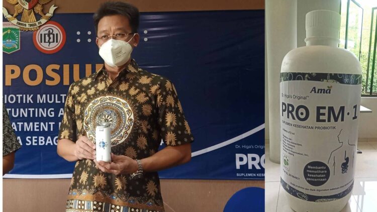 Dirut PT Agro Mitra Alimentare, Ge Recta Geson bersama Dosen dan Peneliti Apt Tjie Kok, S.Si, M.Si., PhD menunjukkan produk Pro EM 1 yang disebut dapat mencegah terjadinya stunting pada anak.