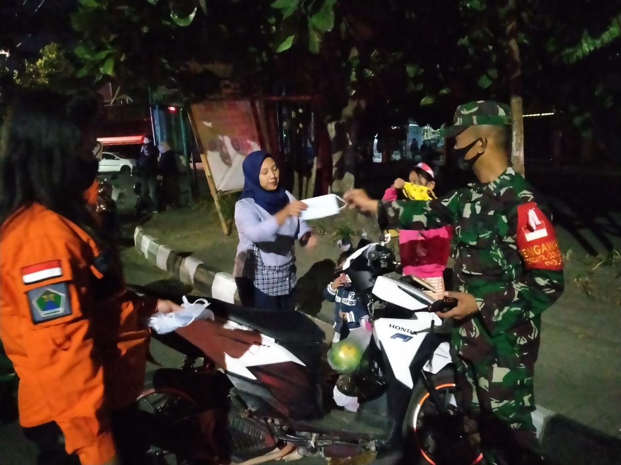Sementara itu satu tim yang lain bergerak ke lokasi fasilitas umum yang banyak dikunjungi oleh masyarakat malam hari kemarin. Para petugas memberikan masker kepada masyarakat yang belum menggunakan masker dan memberikan himbauan penerapan protokol kesehatan covid 19.