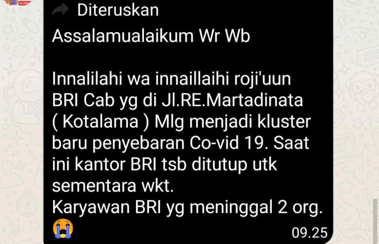 MalangSatu – Beredarnya informasi melalui group daring (whatsapp) tentang puluhan pegawai BRI di Malang terpapar Covid-19 akibat adanya pegawai bank tersebut yang meninggal dunia, akhirnya mendapatkan tanggapan dari Satuan Tugas (Satgas) Covid-19 kota Malang.