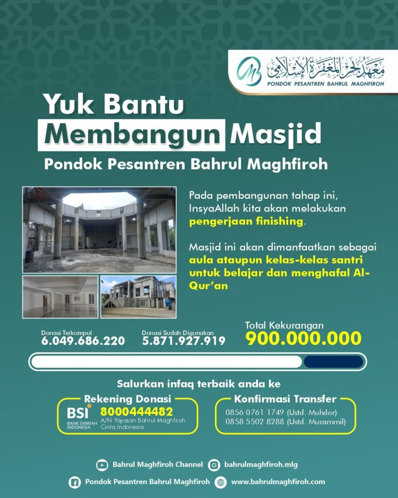 “Dibangun di tahun 2020, Masjid Bahrul Maghfiroh ini membutuhkan dana hingga Rp.12 miliar dimana kami di Pondok Pesantren tidak memiliki modal yang banyak tetapi dapat terkumpul hingga Rp.6 miliar dari para jamaah dan wali santri,” ujar pria ramah ini.